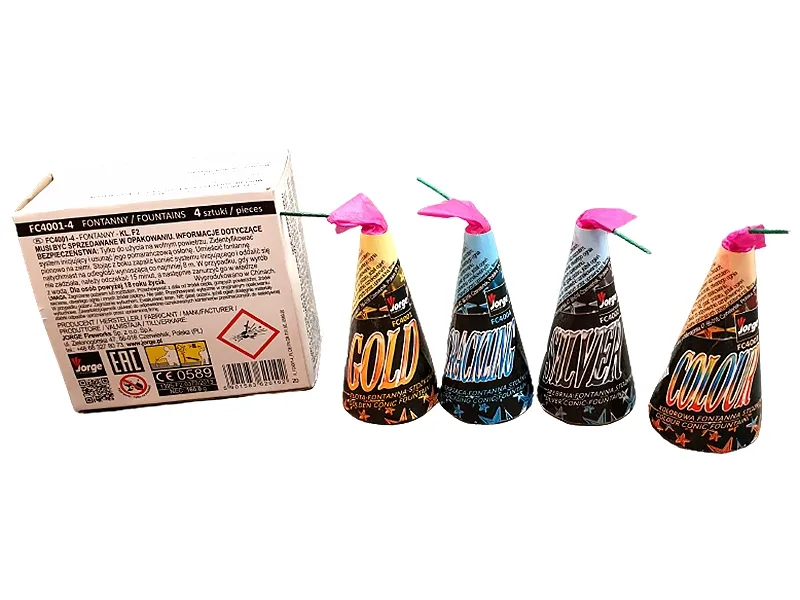 Mix 4 fontann w opakowaniu. Złota, srebrna, kolorowa i trzeszcząca. 4 szt. w opakowaniu.