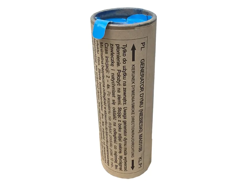 Dwustronny generator dymu o intensywnym niebieskim zadymieniu. Bardzo dobra jakość i duże zadymienie. Idealne do ASG i na Paintball lub dowolne imprezy plenerowe. Produkt odpalany za pośrednictwem pociągnięcia zawleczki. Czas działania: ok. 60 sek
