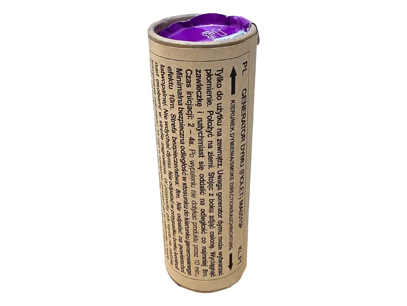 Dwustronny generator dymu o intensywnym filotetowym/purpurowym zadymieniu. Bardzo dobra jakość i duże zadymienie. Idealne do ASG i na Paintball lub dowolne imprezy plenerowe. Produkt odpalany za pośrednictwem pociągnięcia zawleczki. Czas działania: ok. 60 sek