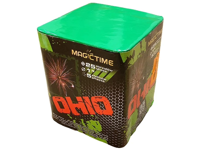 Wyrzutnia 25 strzałów. Kaliber 25mm Srebrne chrysyantemy i fioletowe perły, zielone perły i biały migotanie, brokatowa palma z trzaskiem, fioletowo-zielona palma z białym migotaniem, brokatowa palma z trzaskiem.