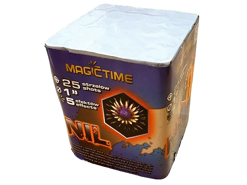 Wyrzutnia 25 strzałów. Kaliber 25mm Czerwona dalie z białym migotaniem, pomarańczowo-zielone perły i biały brokat, zielona perła chryzantemą, brokatowe korony z cracklingiem, brokatowe korony ze srebrną chryzantemą.