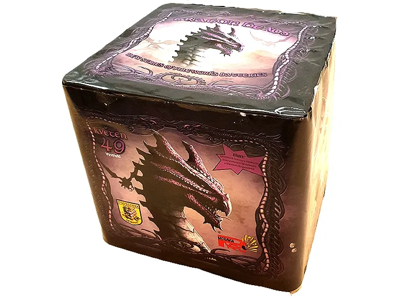 Kolekcja Smoków od Czeskiego importera Pyro Moravia. 49 strzałów Kaliber 30mm Brokatowe korony z niebieskimi kulkami, purpurowe peonie z tytanowymi chrysantemami.
