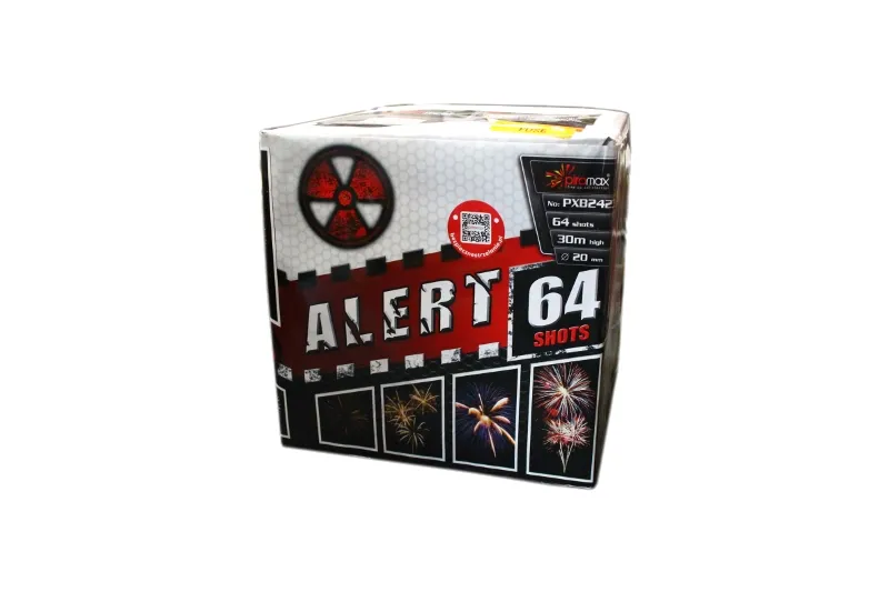 PXB2423 - 64 strzałowa wyrzutnia ALERT 64; efekty: srebrny ogon z czerwoną palmą i białym migotaniem, srebrny ogon z zółtymi i czerwonymi gwiazdami, srerbny ogon z zieloną palmą i białym migotaniem, srebrny ogon z czerwonymi gwiazdami i trzeszczeniem, srebrny ogon z trzeszczącą chrysantemą, srebrny ogon z brokatową koroną.