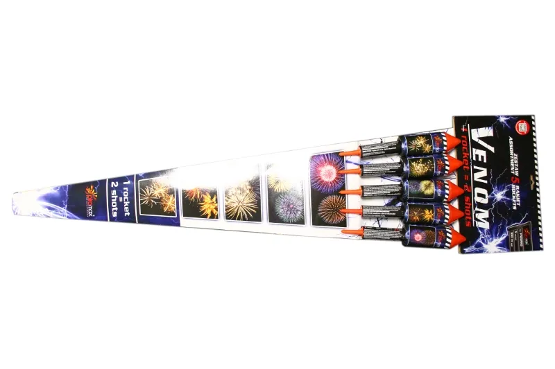 Opakowanie 5 dużych rakiet Każda rakieta jest dwu efektowa dzięki podwójnym szelkom zamontowanym w korpusie Rozrzucenie efektu następuje jedno po drugim