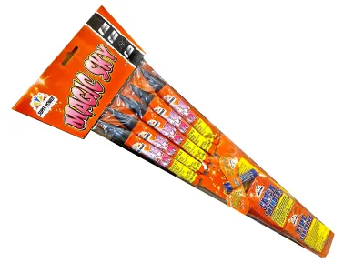 Zestaw "Magic Sky" od firmy Super Power . Zawiera 5 sztuk rakiet z kolorowymi efektami oraz dodatkowo petardy hukowe i duży latający motyl.