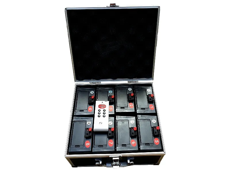 System do odpalania fontann scenicznych. Ilość odbiorników: 8 Idealne rozwiązanie do odpalania fontann scenicznych podczas uroczystości weselnych, urodzin. Daje swobodę rozstawiania fontann bez konieczności przedłużania i rozwijania przewodów. W komplecie pilot (z baterią w zestawie) i 8 systemów zasilanych bateriami 9V (niedołączone do zestawu), podstawki umożliwiające ustawienie kątowe fontann.