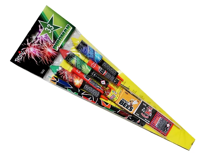 Zestaw rodzinny składający się z artykółów różnych (motylki, petardy, rzymskie ognie, diabełki) w tym 5 rakiet!