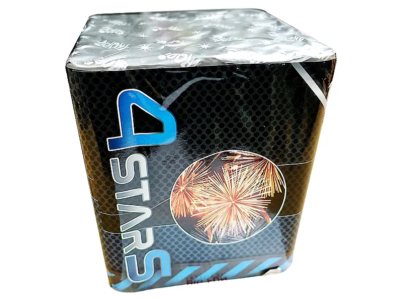 Bateria 4 stars od Tropica to złote korony z niebieskimi gwiazdkami w układzie pionowym i kątowym. 21 strzałów 25mm