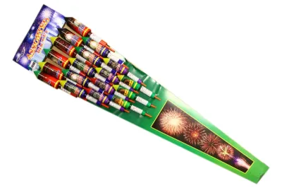 Duży zestaw 18 rakiet. W skład zestawu wchodzi 6 rakiet o długości 95 cm, 5 rakiet o dłgości 80 cm. 4 rakiet o długości 70 cm oraz 3 rakiet o długości 60cm. Rakiety o dużych efektach w różnej kolorystyce m.in. złote trzeszczące chryzantemy, zielone dalie, złote, czerwone, srebrne, zielone gwiazdki