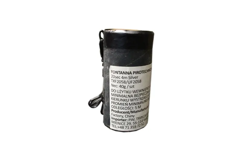 Fontanna sceniczna srebrna o wysokości 4 metrów i czasie działania 25s. Odpalana wyłącznie za pomocą systemu lub baterii 9V. Produkt idelanie nadaje się do użytku w pomieszczeniach. Efekt tak zwanych zimnych iskier niezdolny do podpalenia materiałów palnych.
