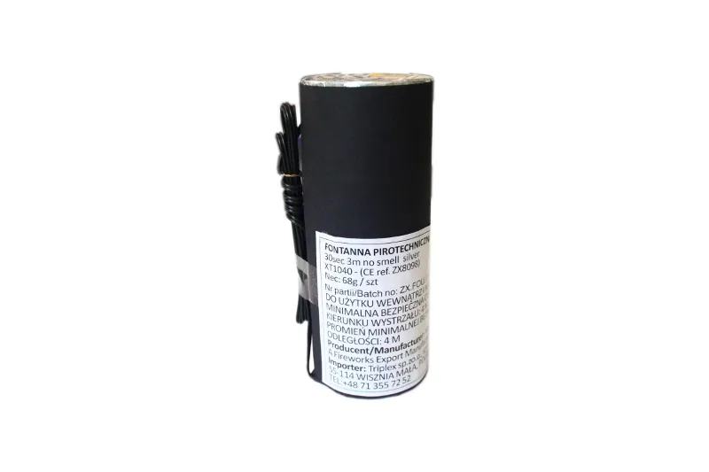 Fontanna sceniczna srebrna o wysokości 3 metrów i czasie działania 30s. Odpalana wyłącznie za pomocą systemu lub baterii 9V. Produkt idelanie nadaje się do użytku w pomieszczeniach. Efekt tak zwanych zimnych iskier niezdolny do podpalenia materiałów palnych.