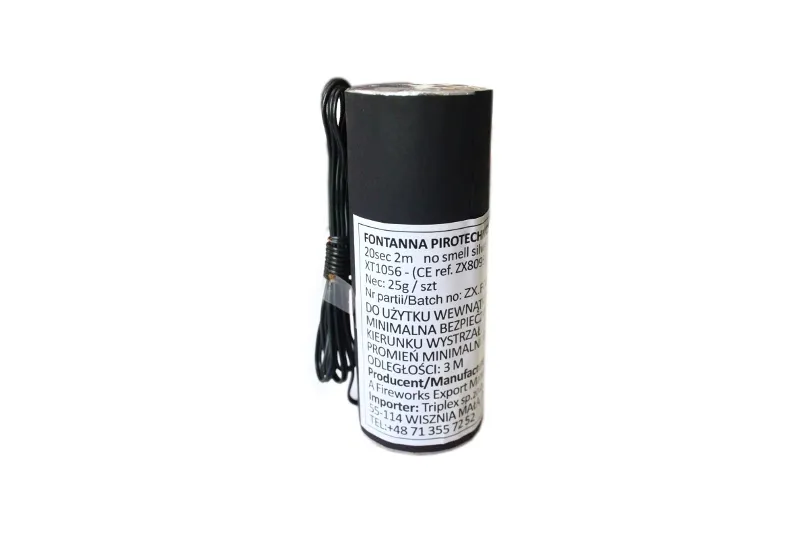 XT1056 FONTANNA SCENICZNA Kategoria CE- T1 Dolot- 2 metry Czas- 20 sekund Kolor- srebrny Zapakowanie- 20/5 Produkt odpalany wyłącznie za pomocą systemu lub baterii 9V Cena za 1 sztukę